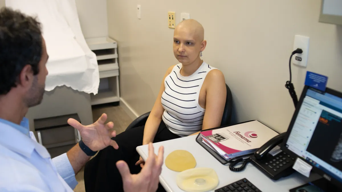 A woman living with breast cancer in consultation at Núcleo Mama, the breast cancer centre at the Hospital Moinhos de Vento in Porto Alegre, Brazil, whose approach to care is designed around the needs and values of each individual. Photo by Ramiro Sanchez commissioned by UICC in collaboration with FEMAMA and Hospital Moinhos de Vento.