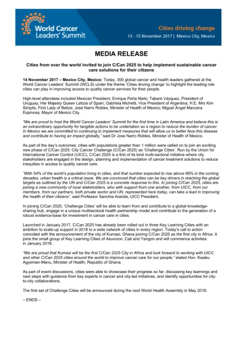 Breadcrumb Home Resources 2017 World Cancer Leaders' summit official press release 2017 World Cancer Leaders' summit official press release Access the resource Resource Information Type of resource Press release Publish date 11 June 2019 Language English Last update Sunday 20 November 2022 Share this page