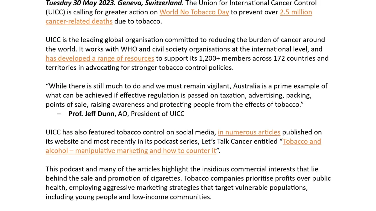 Tuesday 30 May 2023. Geneva, Switzerland. The Union for International Cancer Control (UICC) is calling for greater action on World No Tobacco Day to prevent over 2.5 million cancer-related deaths due to tobacco.
