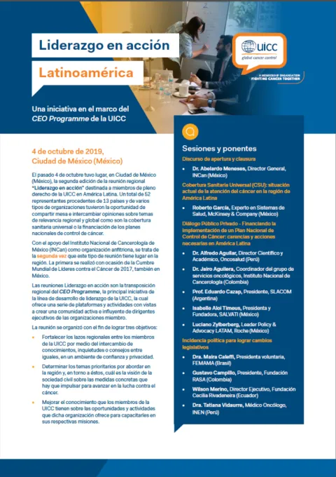 La última reunión de "Liderazgo en acción" para los miembros de la UICC de Latinoamérica tuvo lugar el 4 de octubre 2019 en el Hotel Intercontinental Presidente de Ciudad de México, y contó con el Instituto Nacional de Cancerología de México (INCan) como organización anfitriona.
