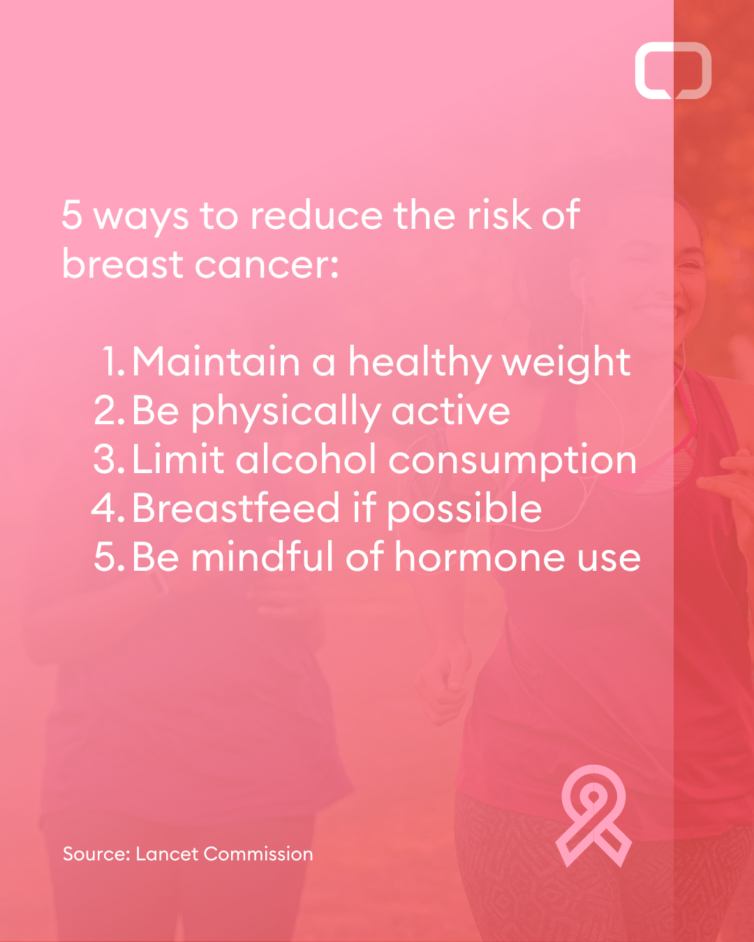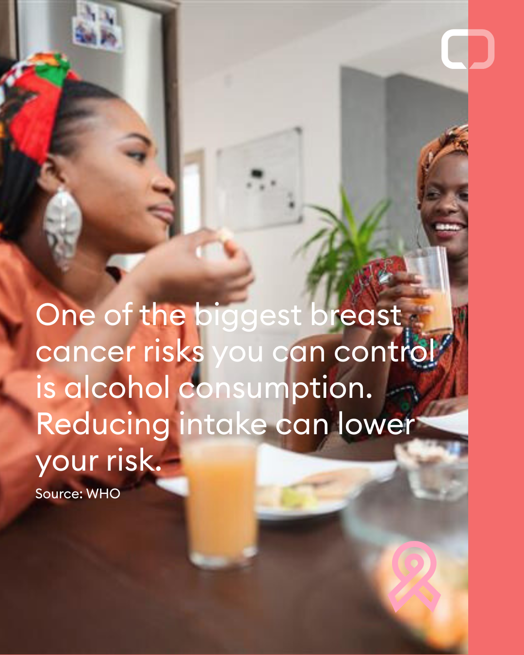 23% of breast cancer cases are preventable. Taking steps such as maintaining a healthy weight, limiting your alcohol intake and quitting smoking, can help reduce the risk. #breastcancer @uicc